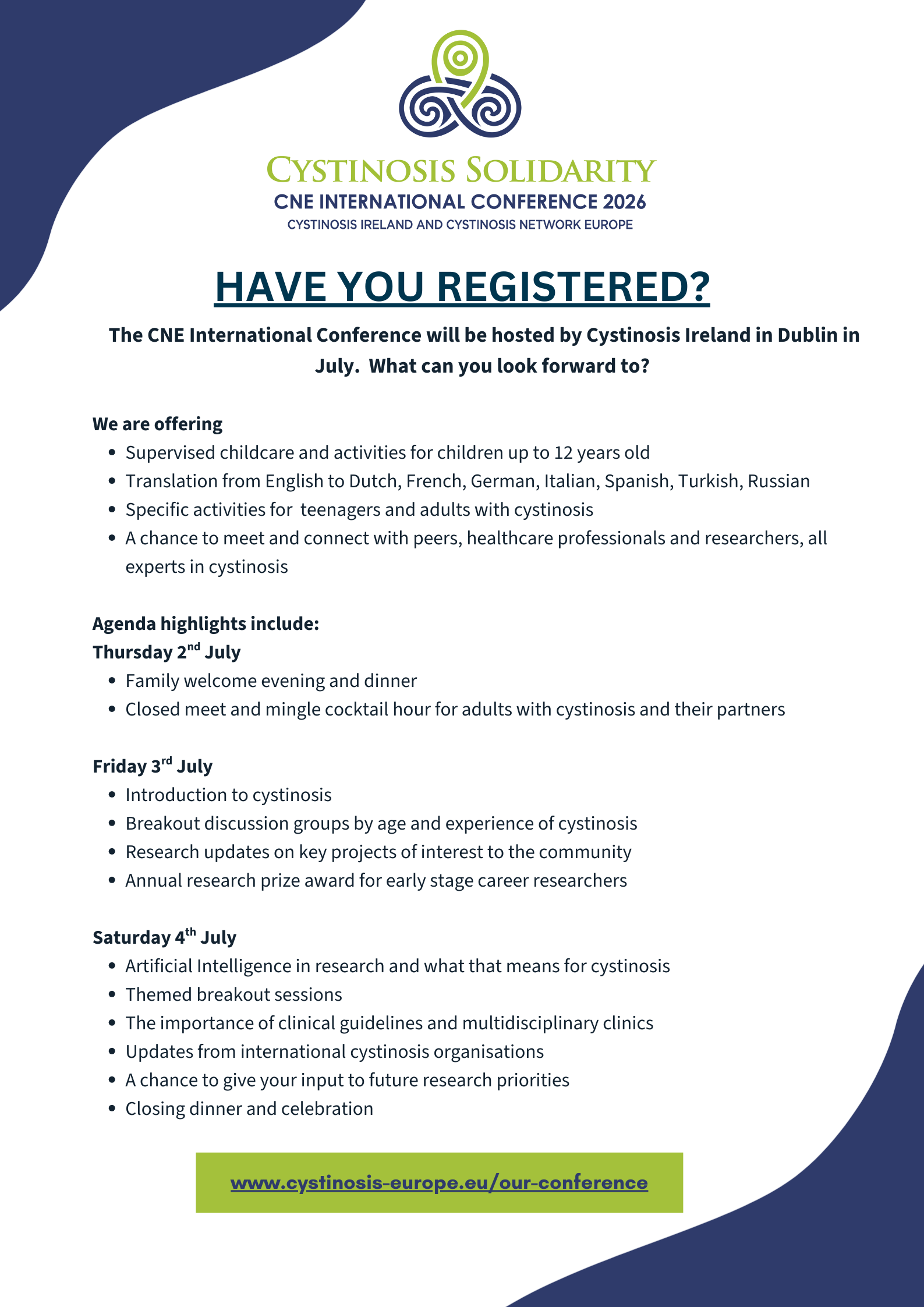 The family welcome event will be on the evening of 2nd July 2026, full agenda days on 3rd & 4th July, and we will close with a family celebration dinner on the evening of 4th July. The meeting will be co-chaired by Prof Atif Awan (Children’s University Hospital, Dublin, scientific chair), Anne Marie O’Dowd (chair, CNE) and Karen McCullagh (Cystinosis Ireland, family chair).